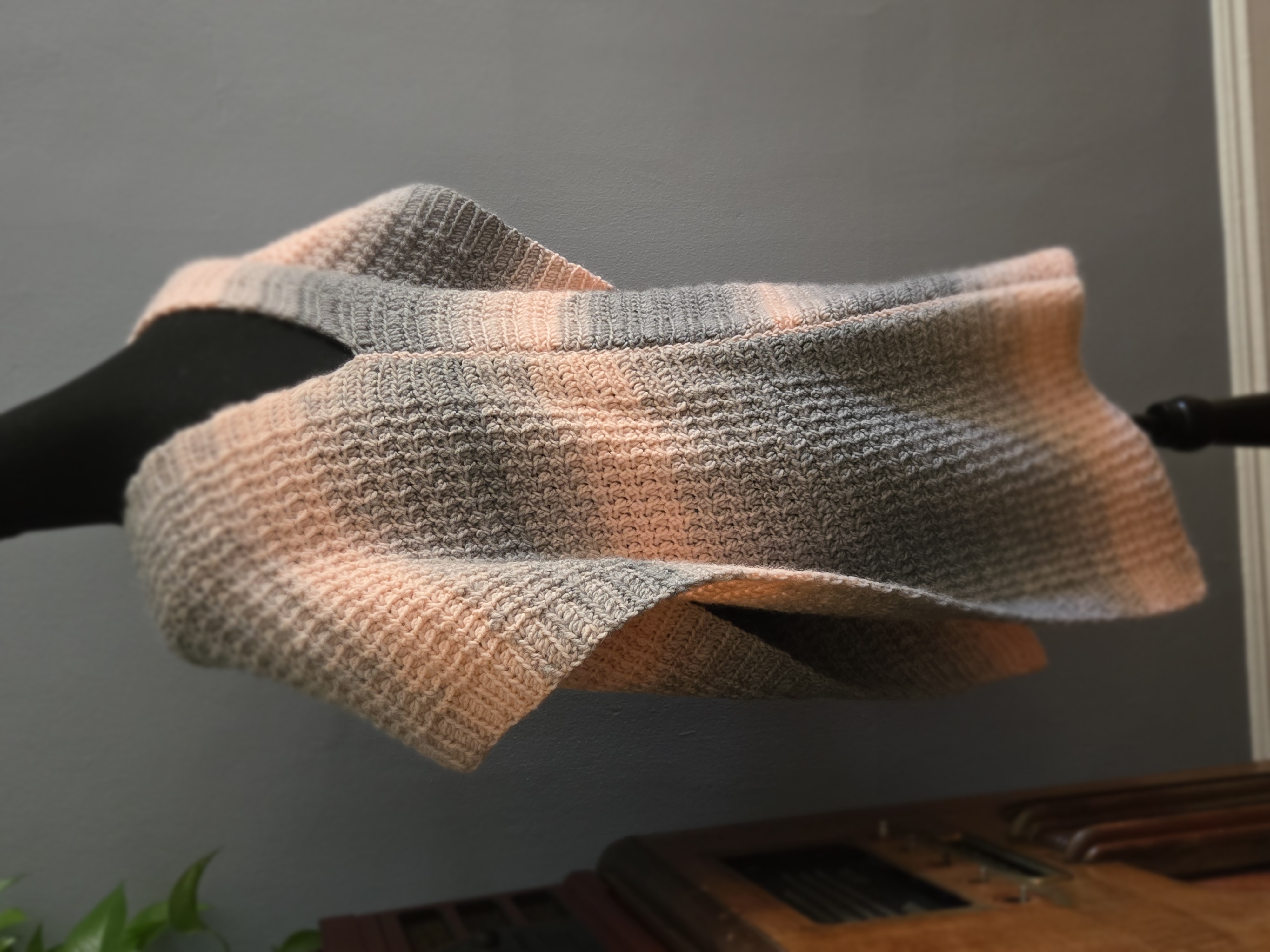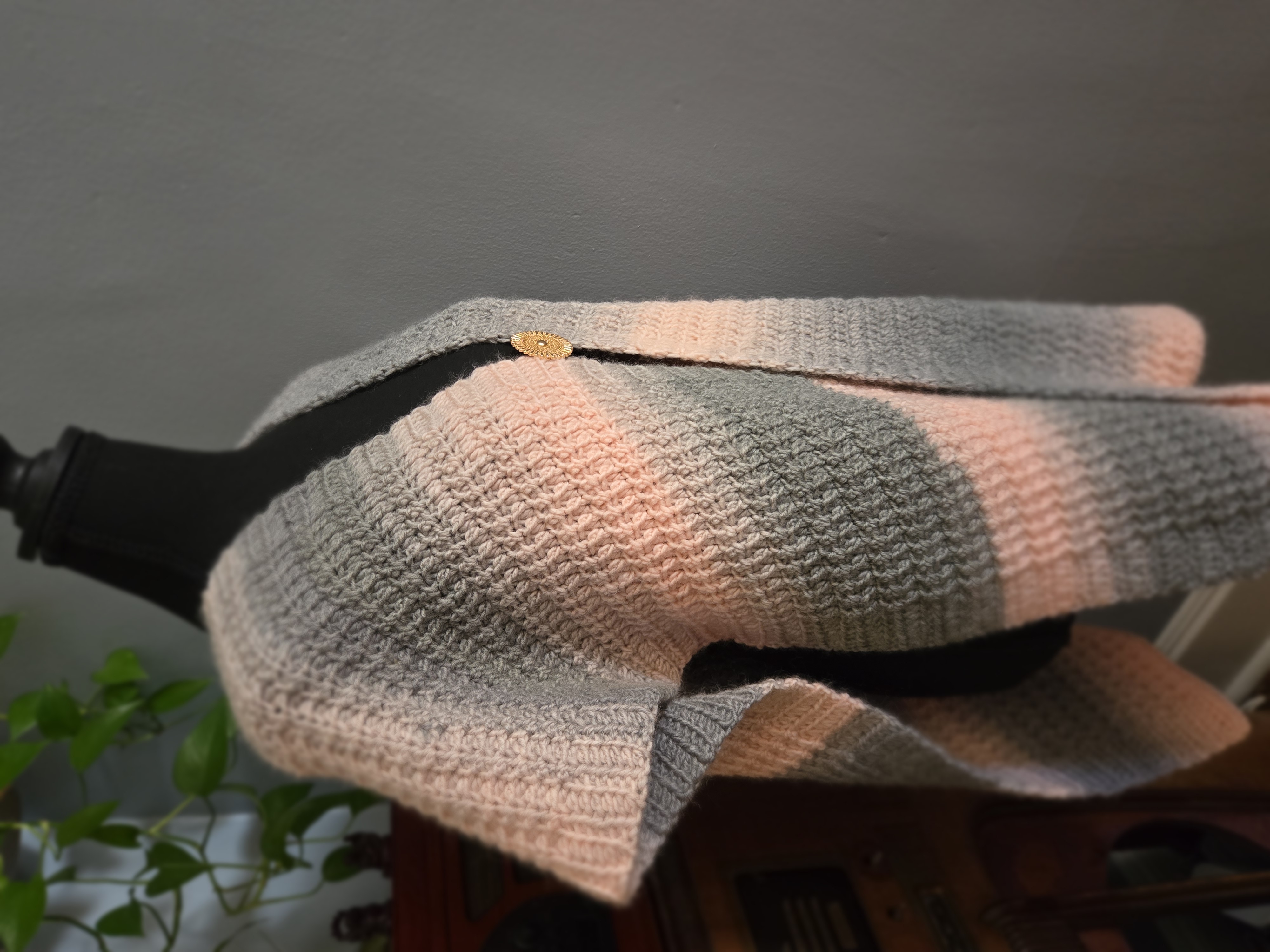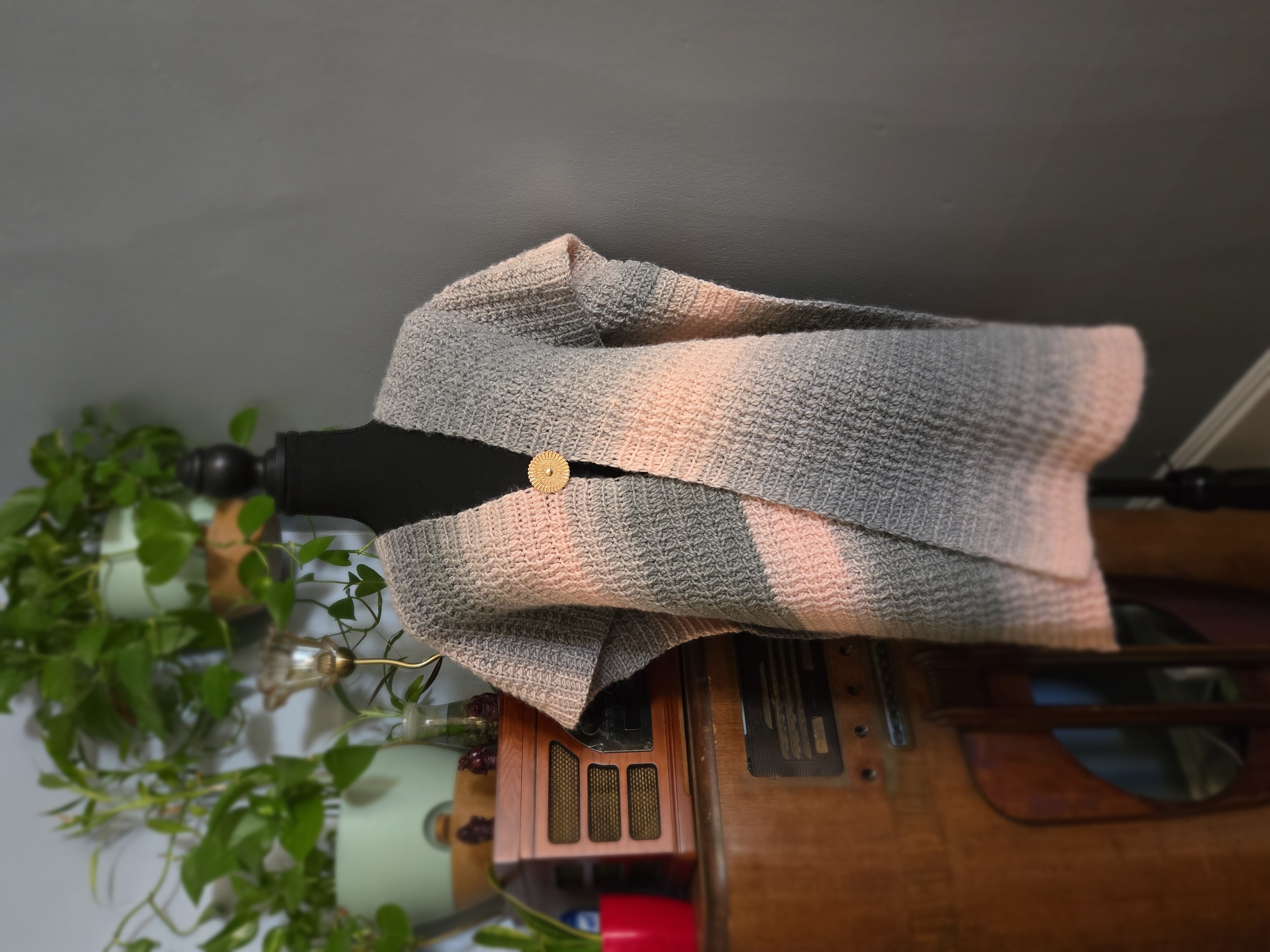 Blushing Pink Poncho is soft and warm with a Medium weight thickness. It can be worn two ways. As an open front Ruana or a shawl garment. A gold color Cinch Clip is included.