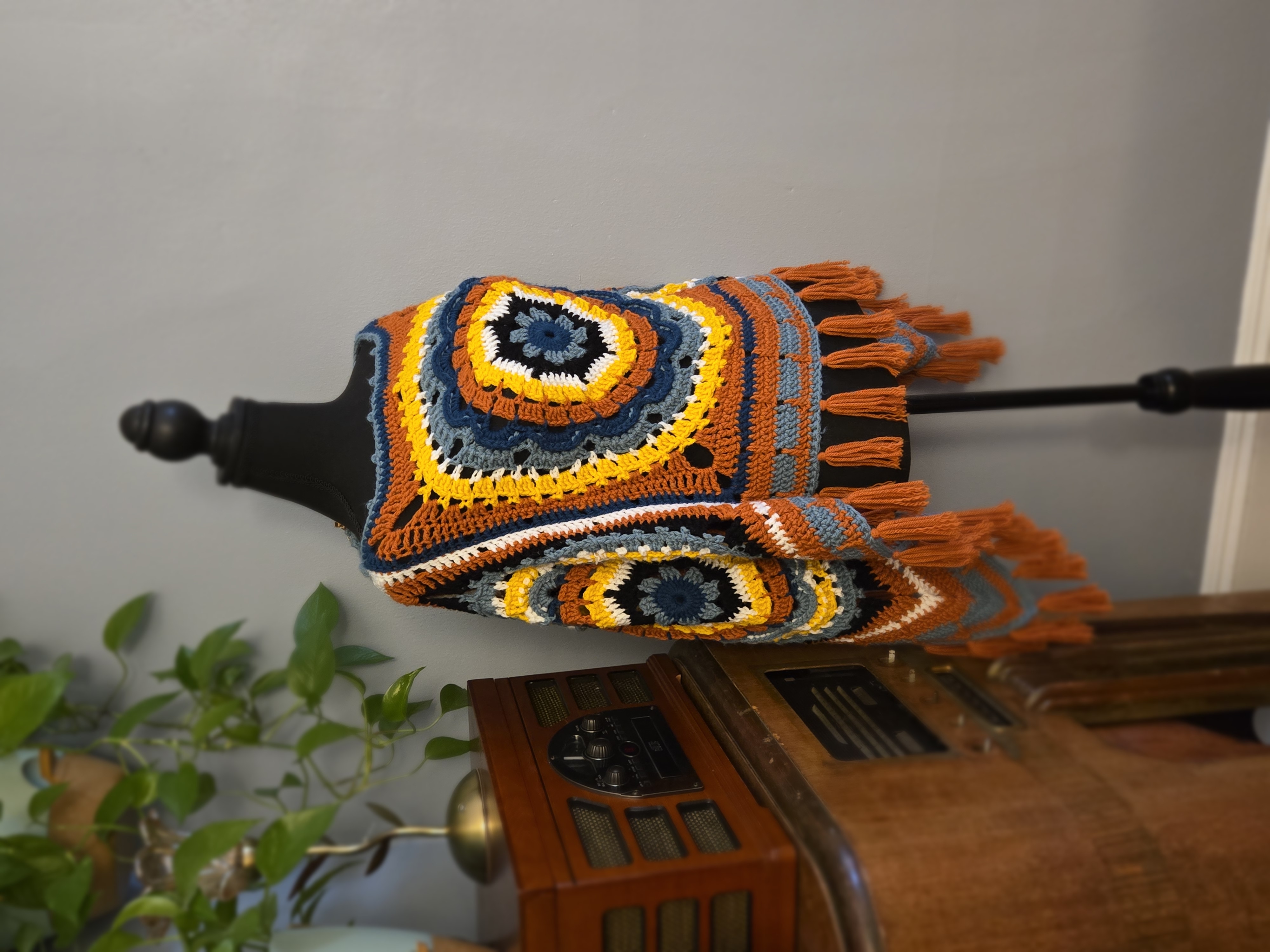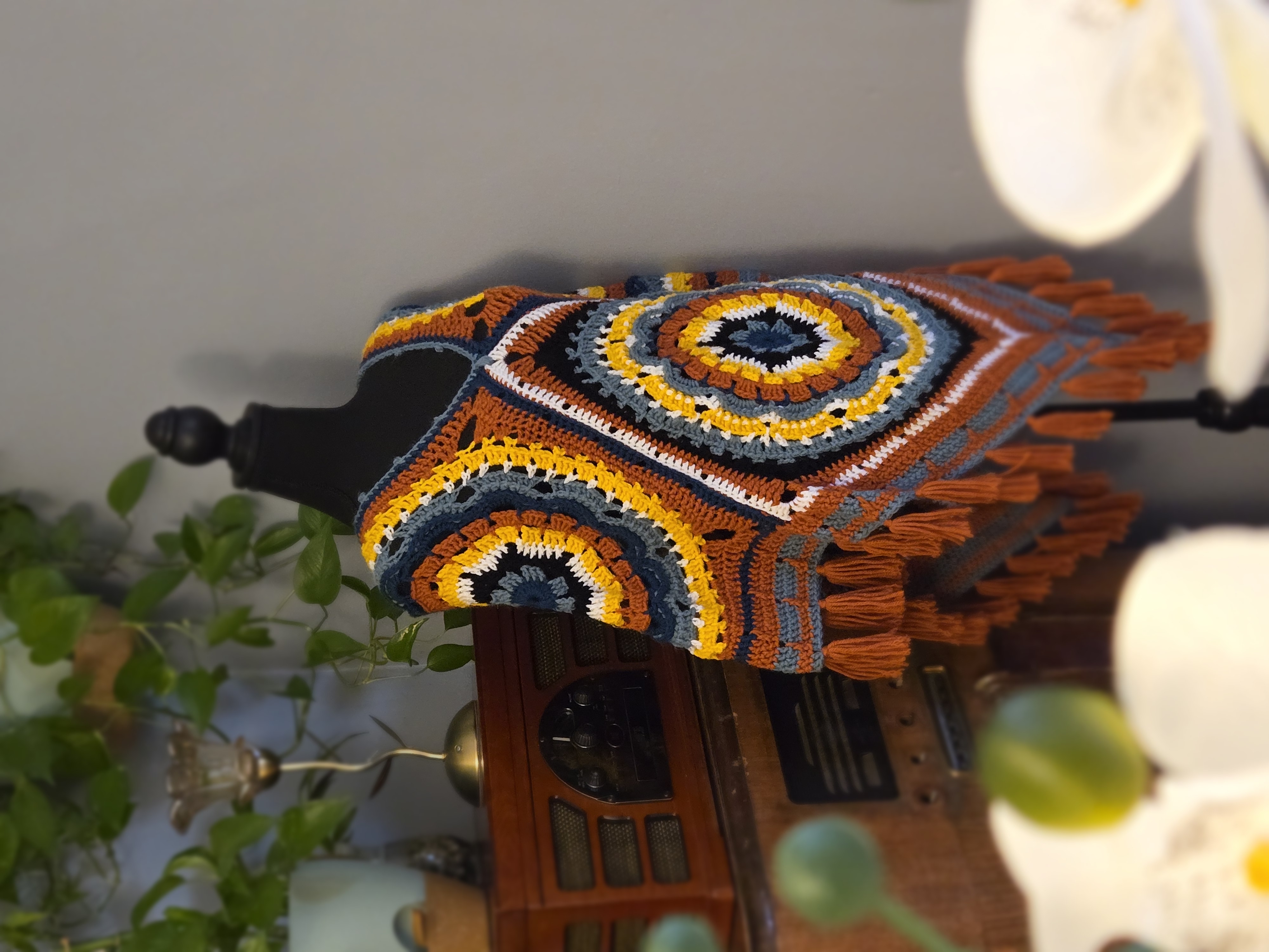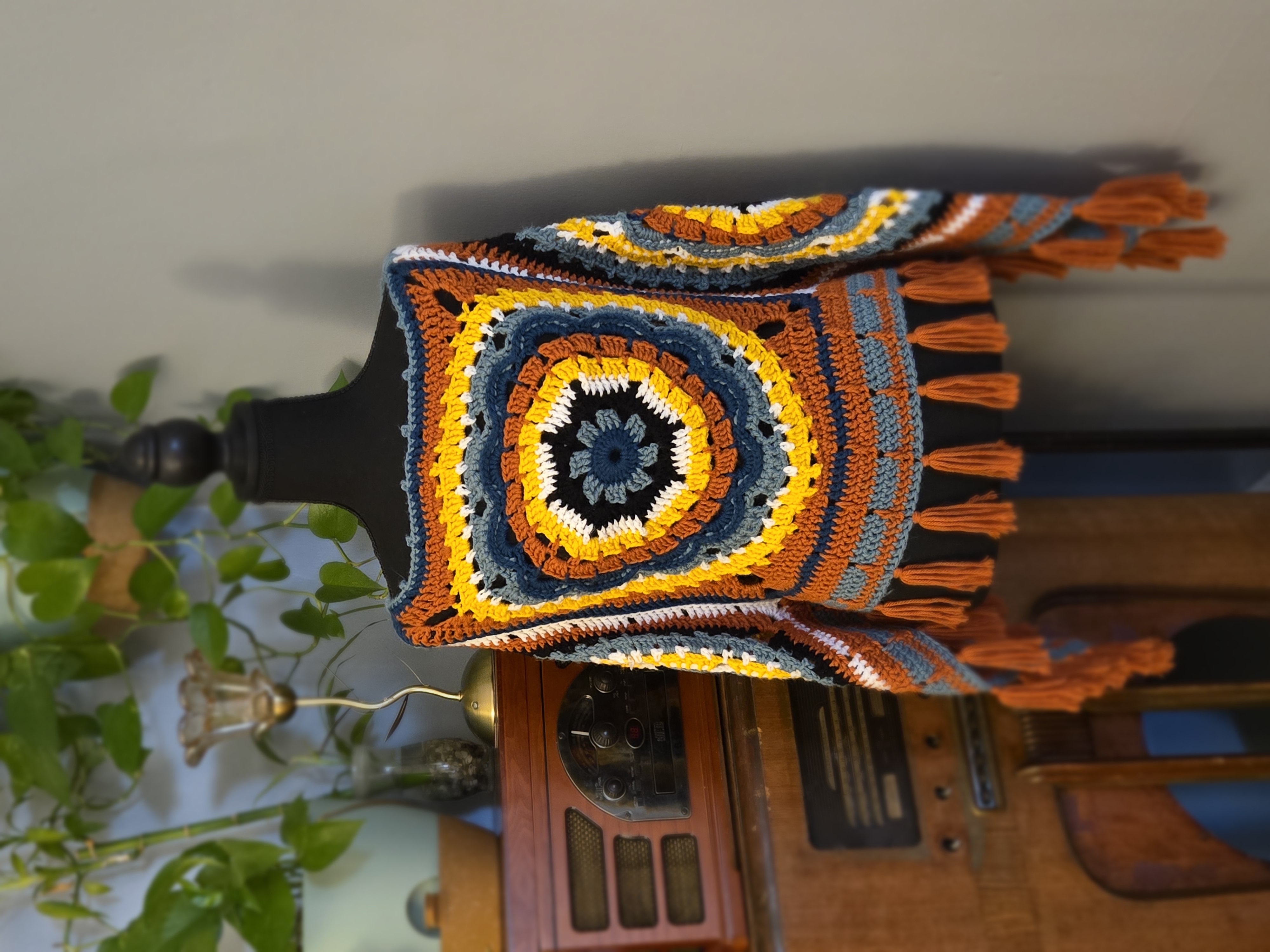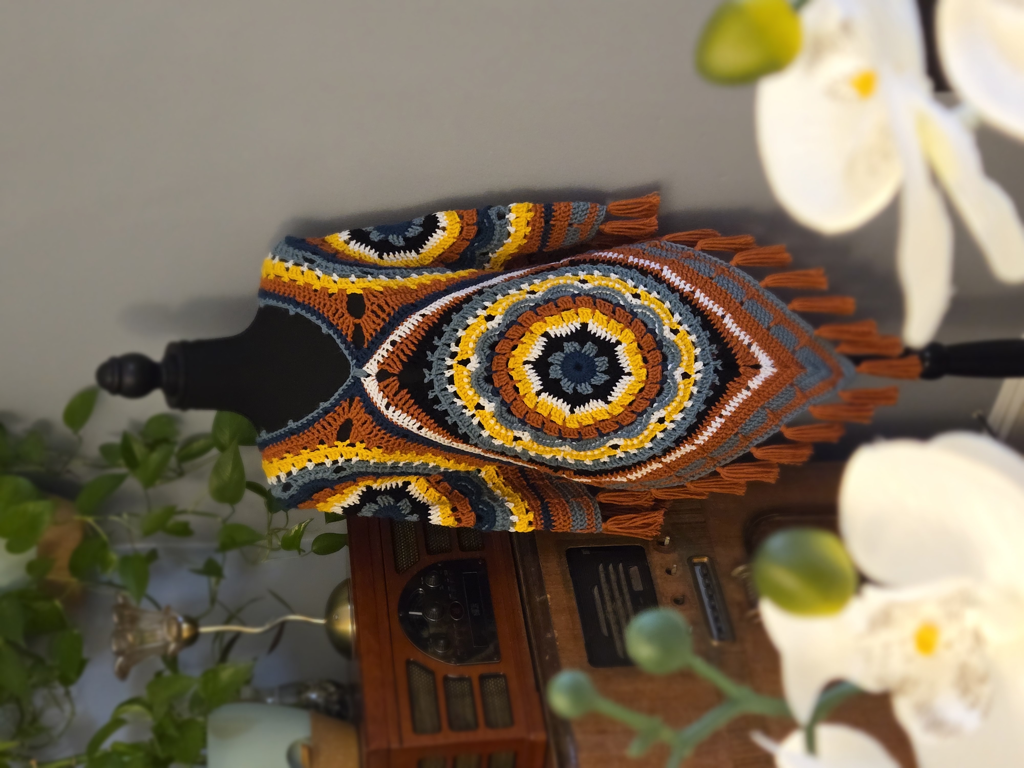 Handmade Crochet Poncho can be worn two ways. Has a medium weight thickness. One of a kind with a flower mandala pattern in the centers.
