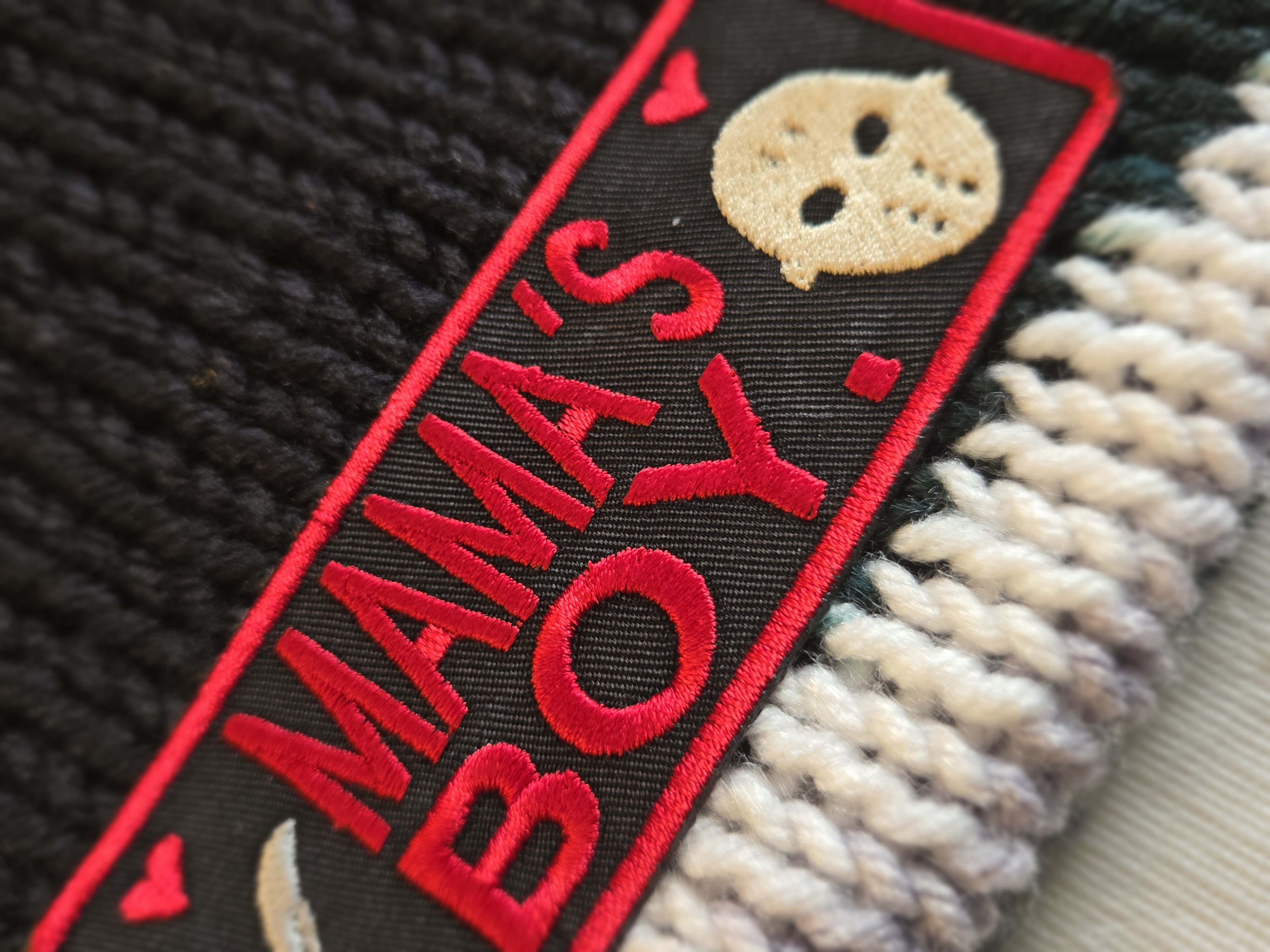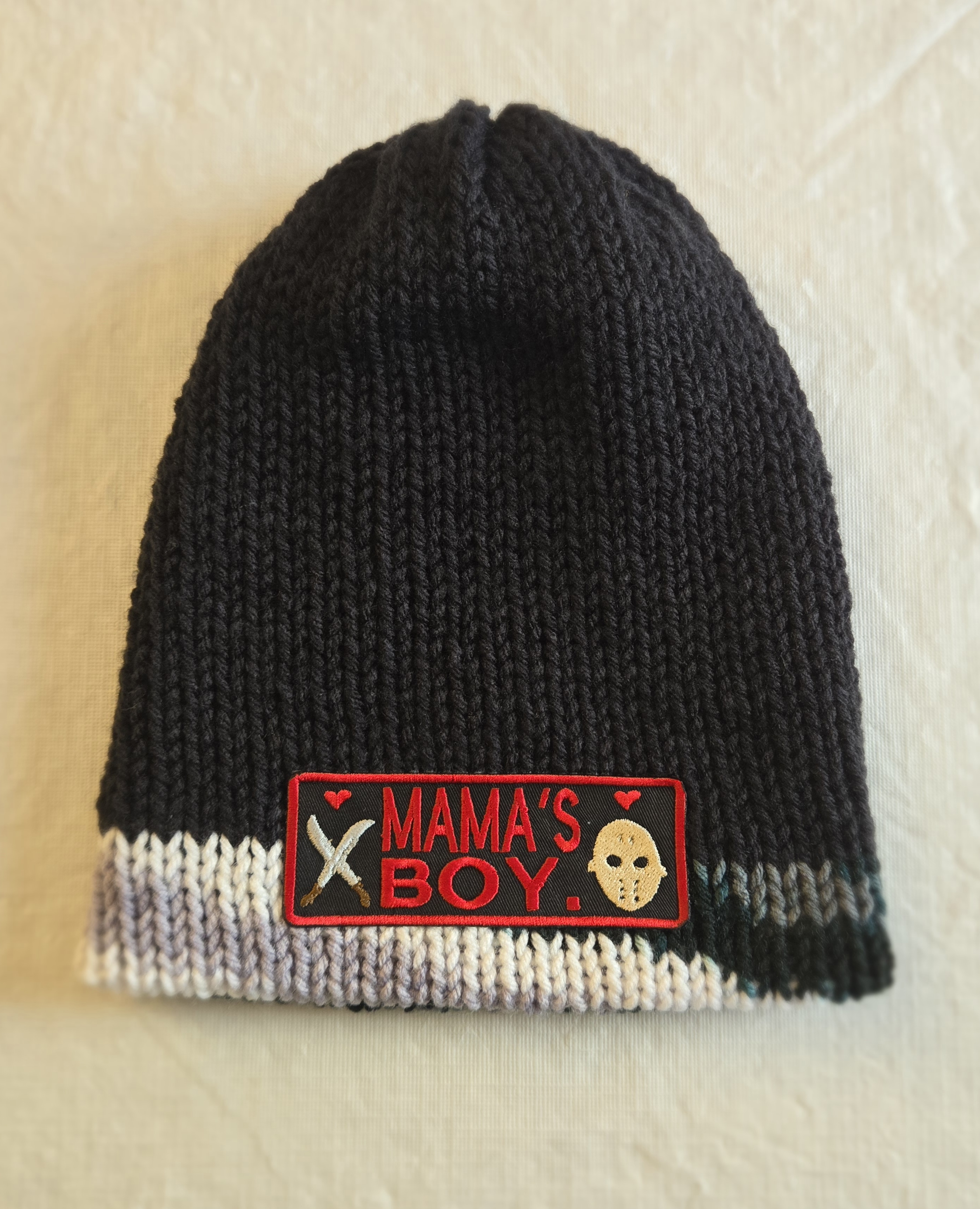 Friday the 13th inspired Beanie with Momma's Boy Patch. Perfect for Scary Movie fanatics.