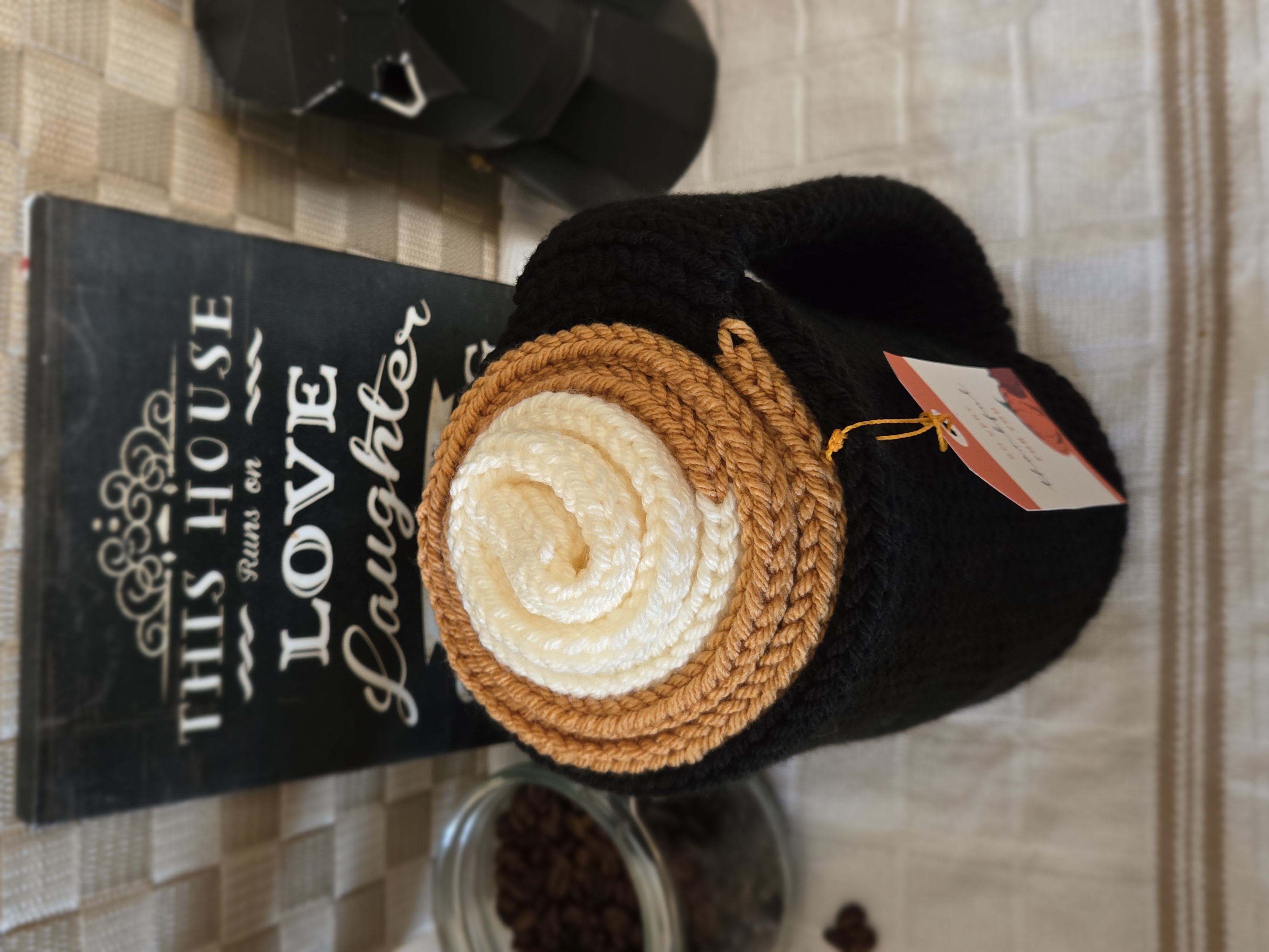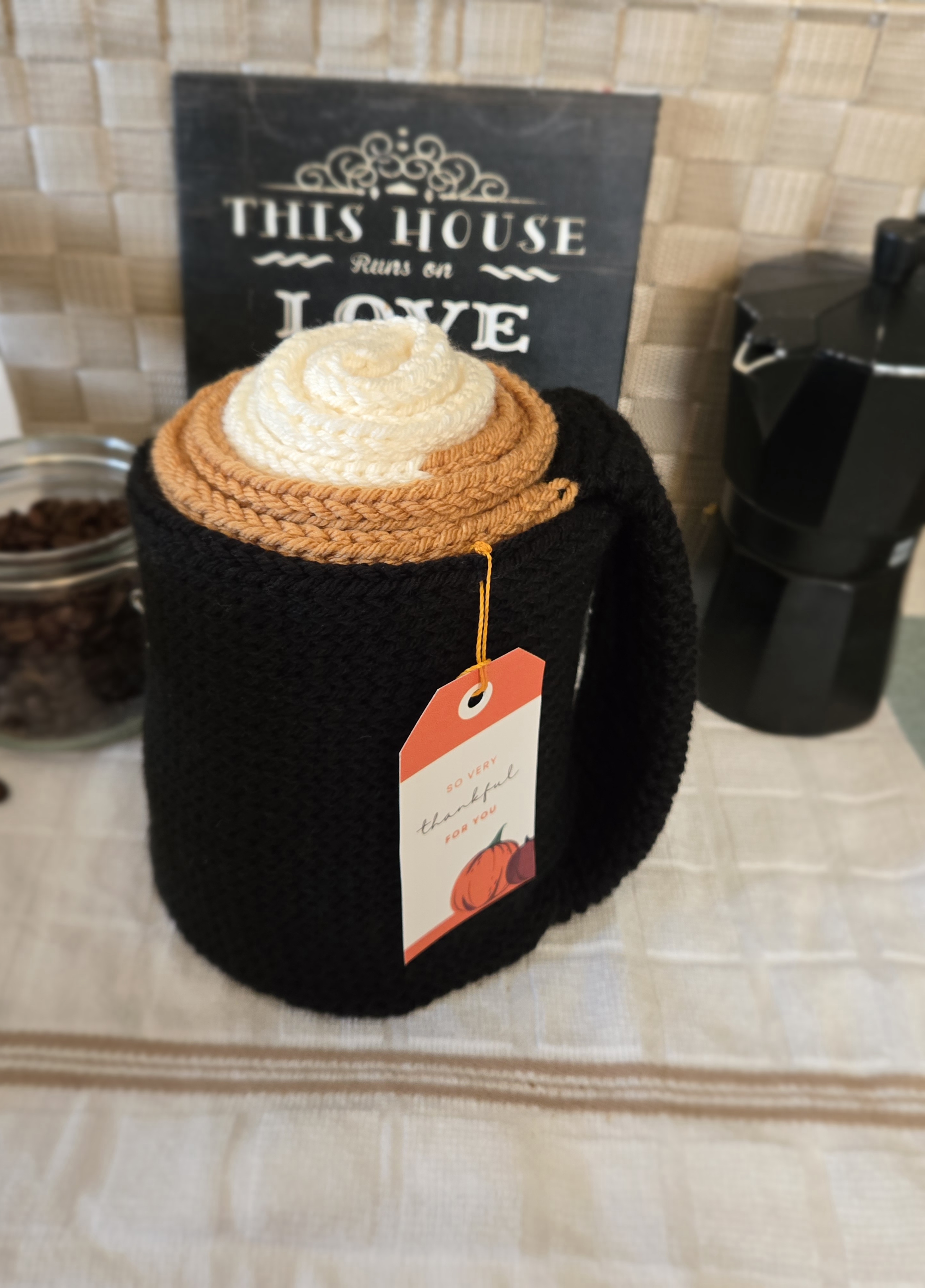 This beautiful knitted scarf rolls into a Latte Cup. The cup handle also doubles as a keyhole to slip scarf through for more secure wear.