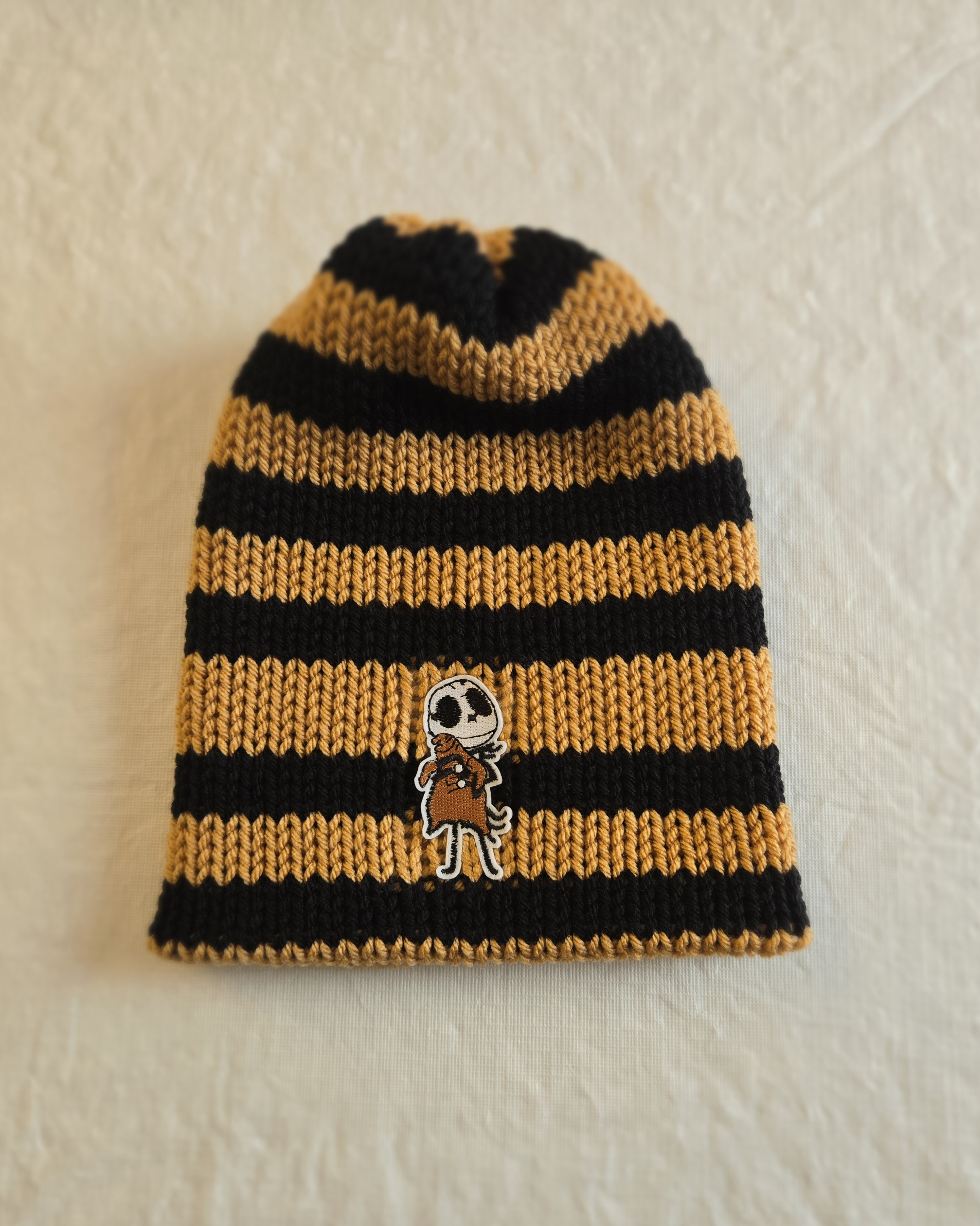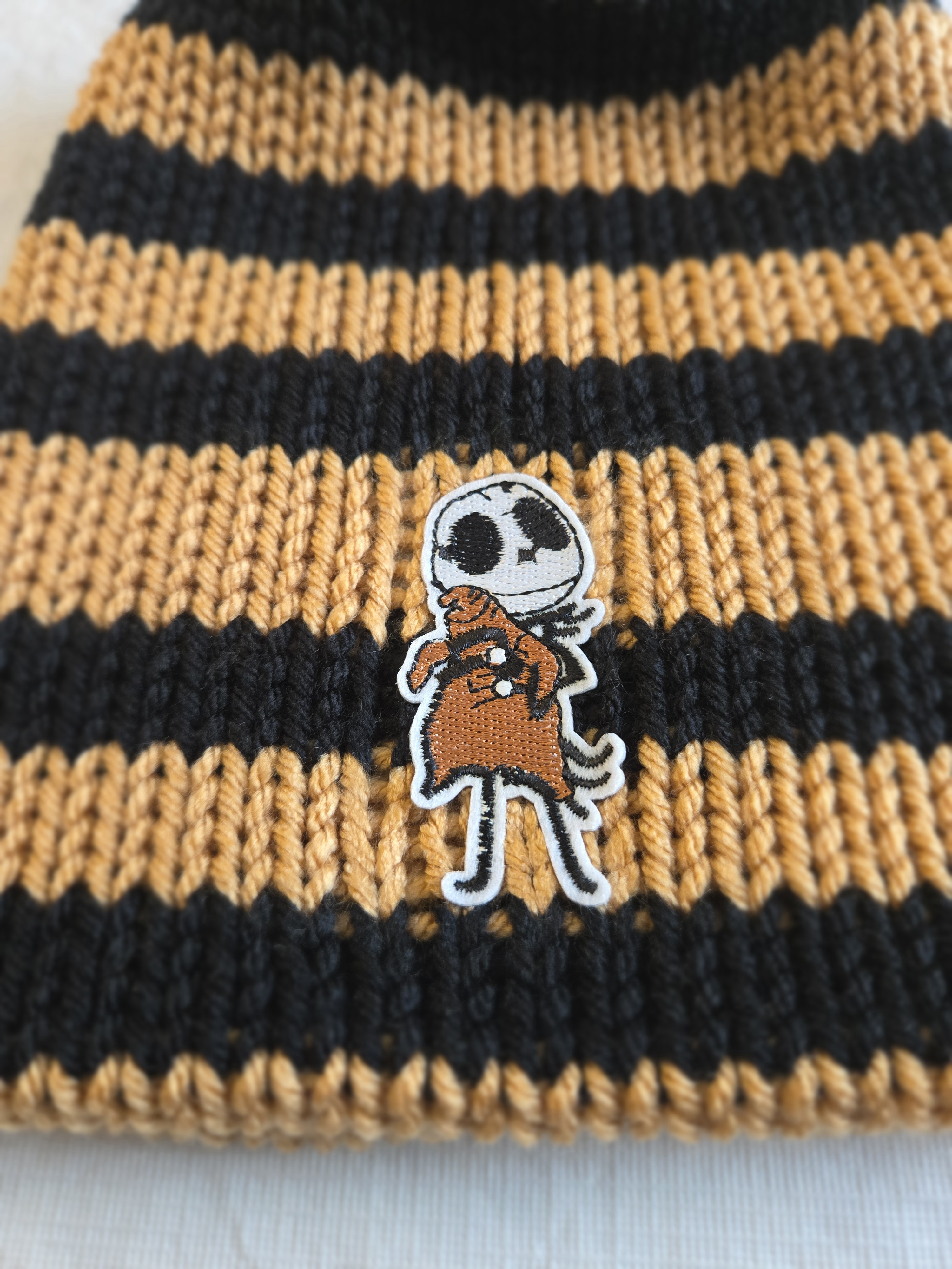Oggie Boogie Beanie is double Knitted with an adorable Jack Skellington patch.