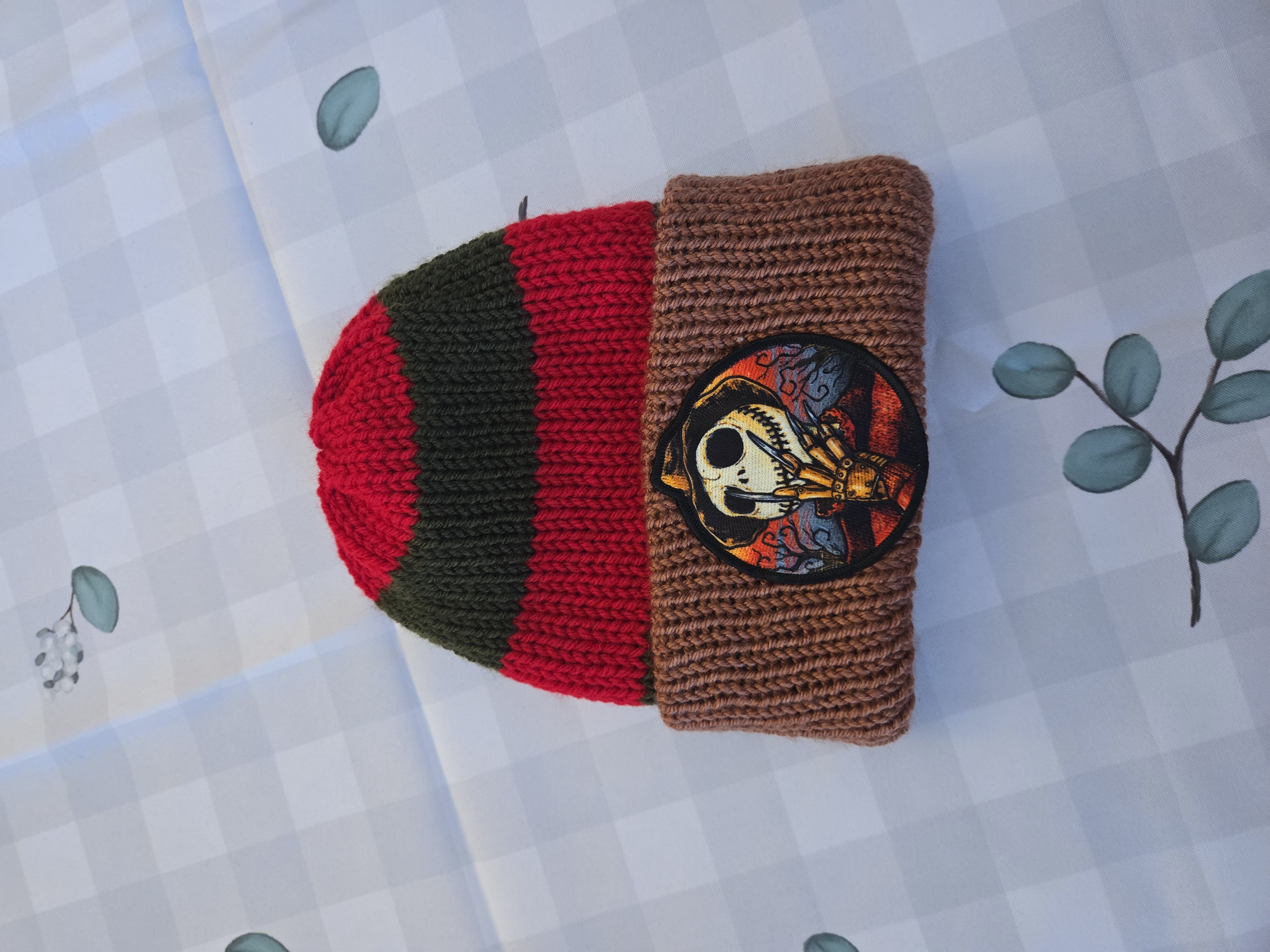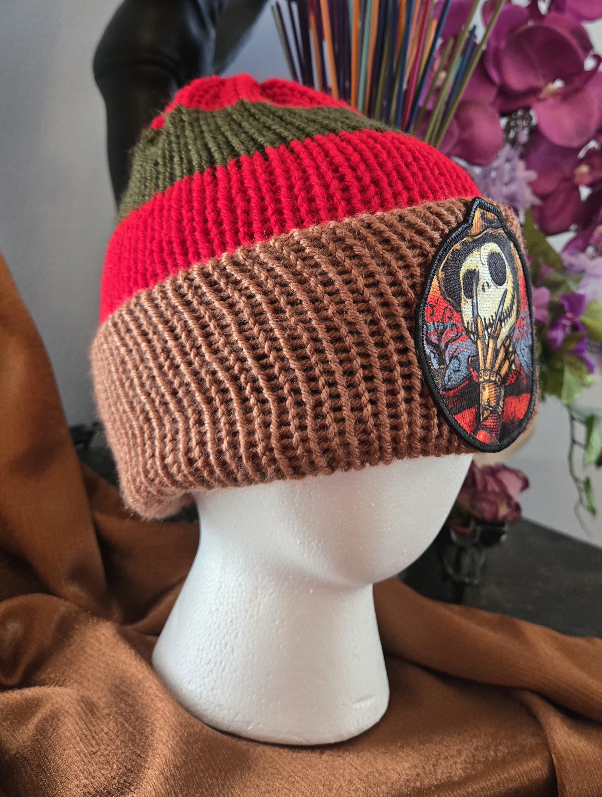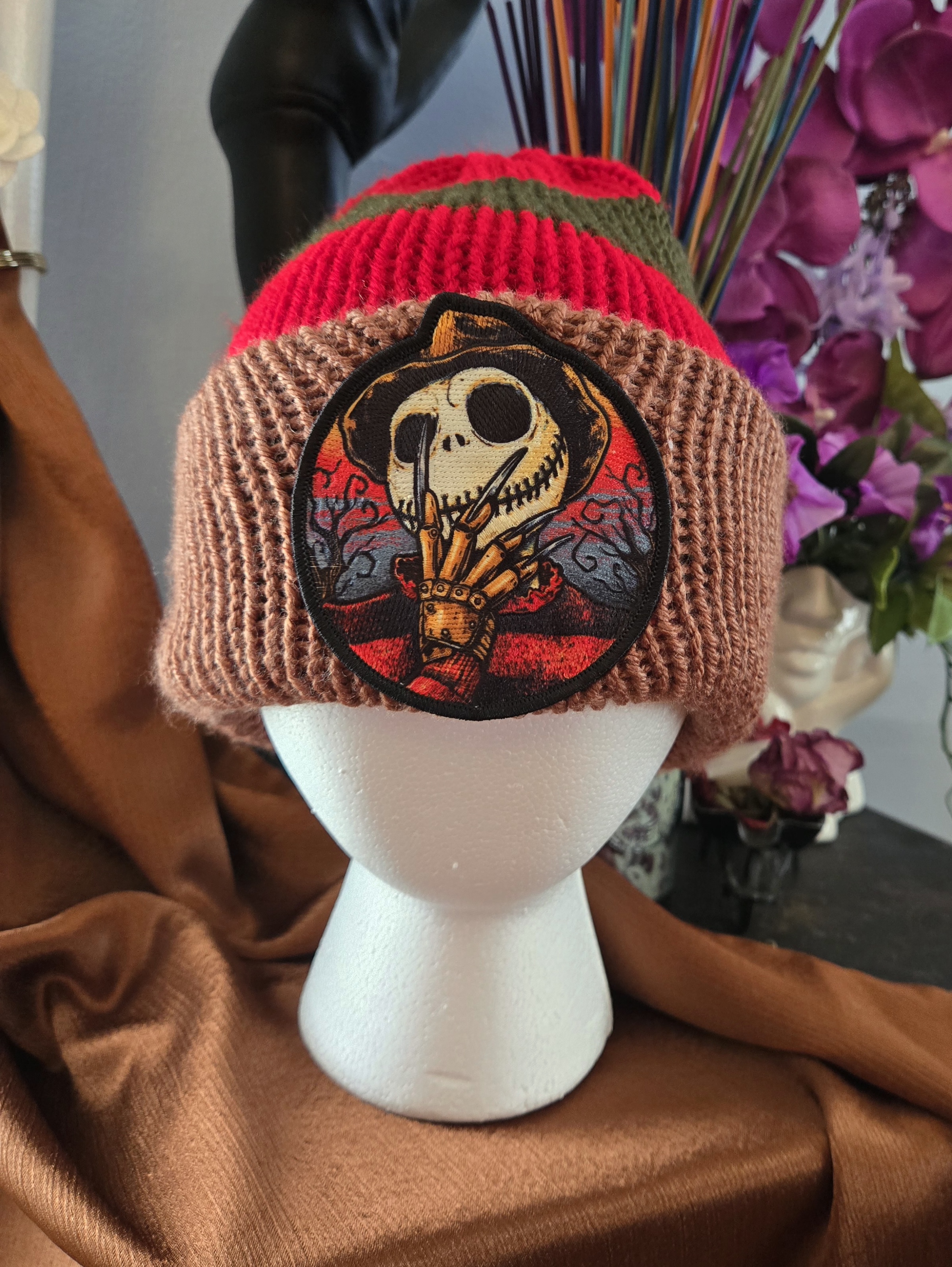 Knitted super soft material with doubled layer brim. Nightmare Before Christmas Freddy Krueger patch.