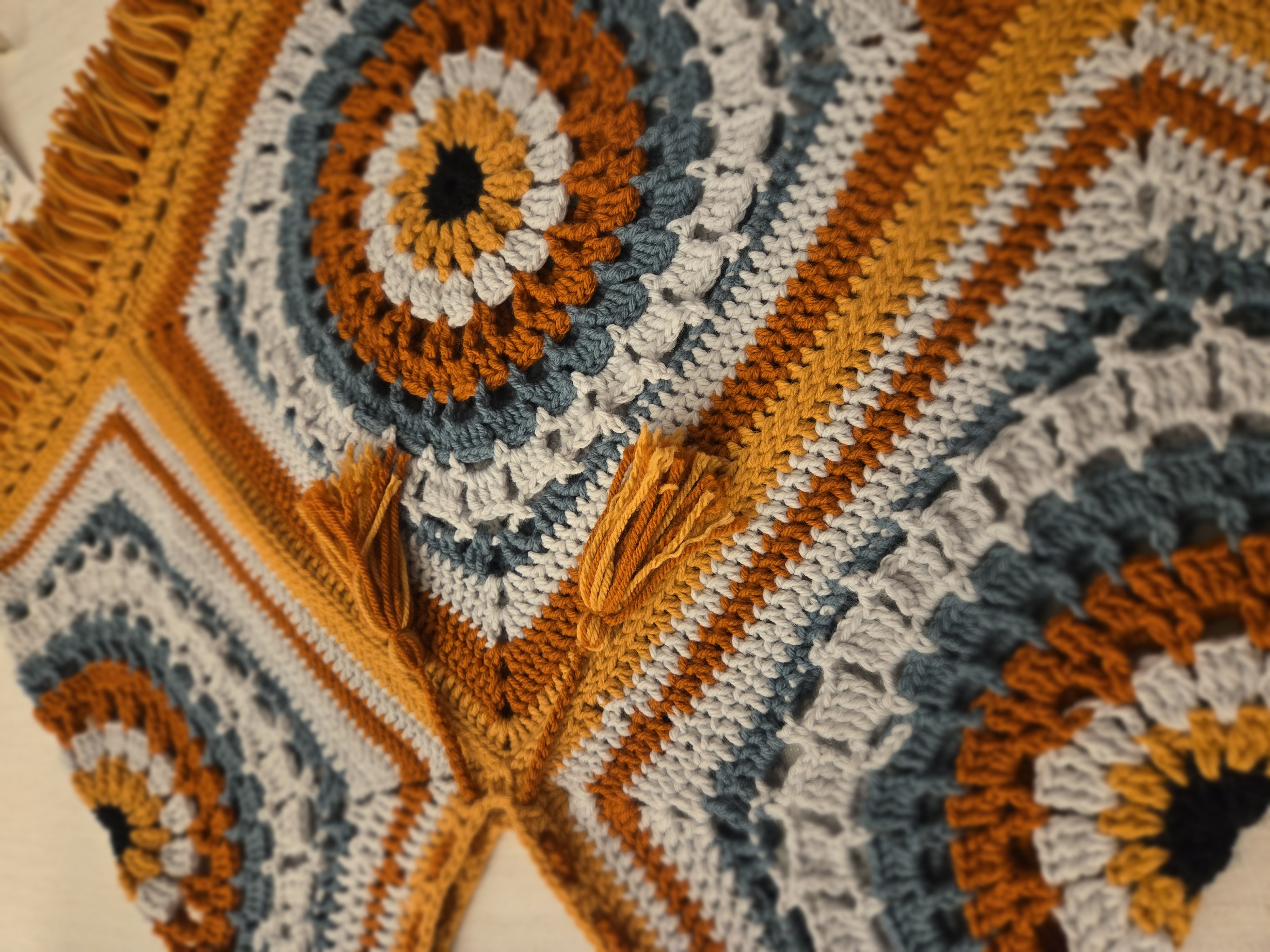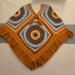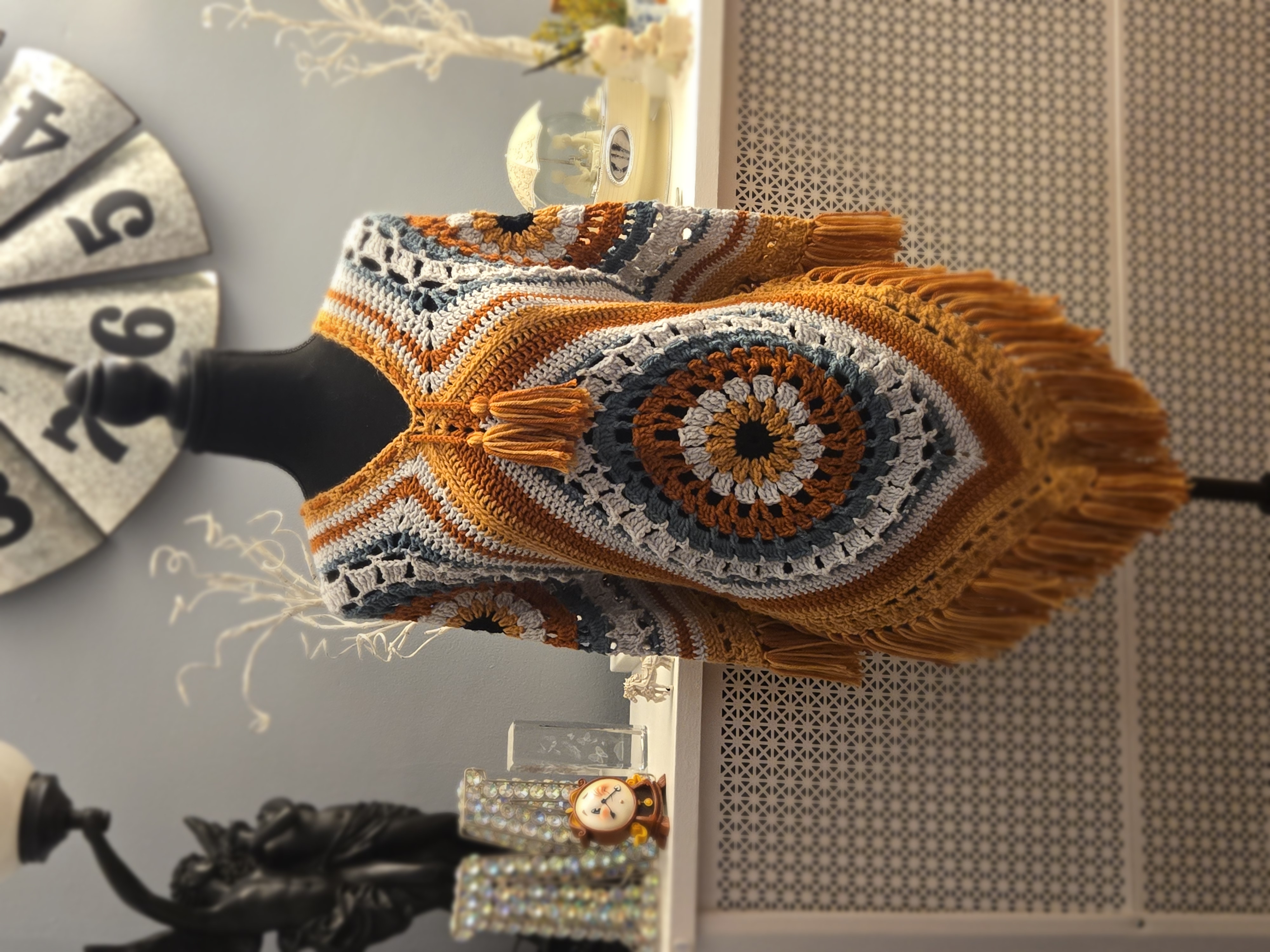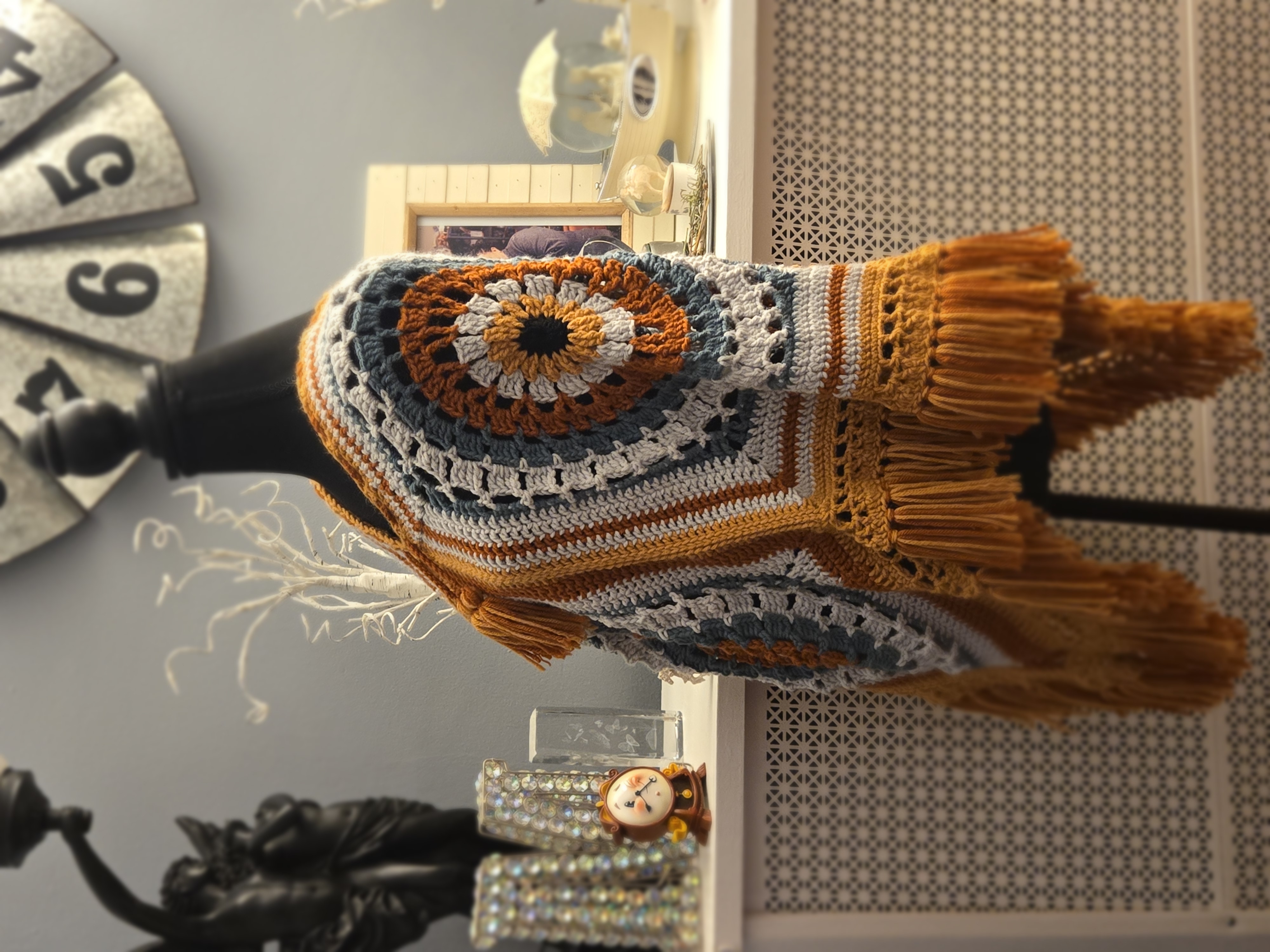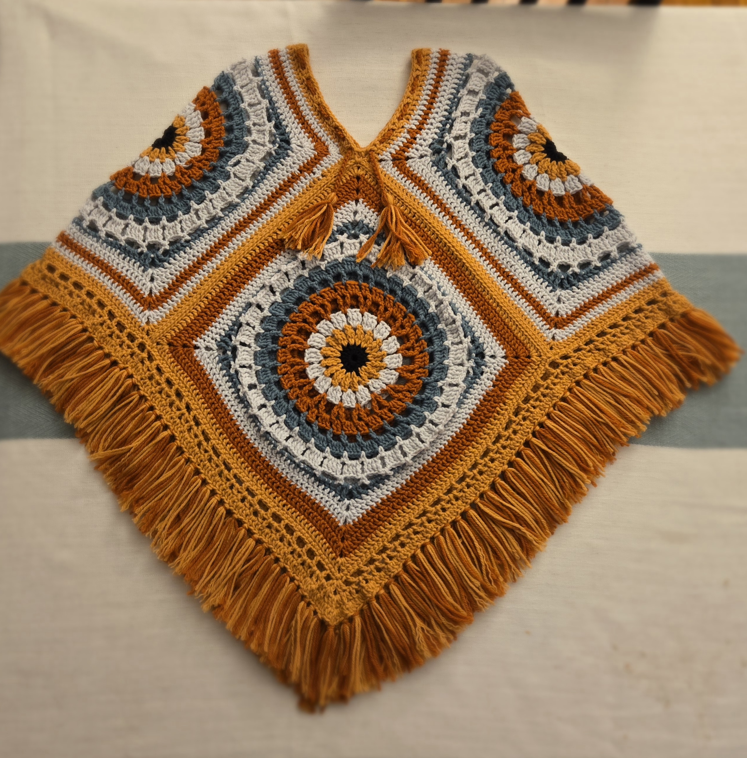 Handmade Crochet Poncho with medium weight thickness. It is warm for the upcoming fall campfires, and comfy. Has an adjustable neck opening with cute tassels. Yarn color selection is specifically chosen for the pattern design. Again no two are alike when it comes to these Ponchos making each unique.