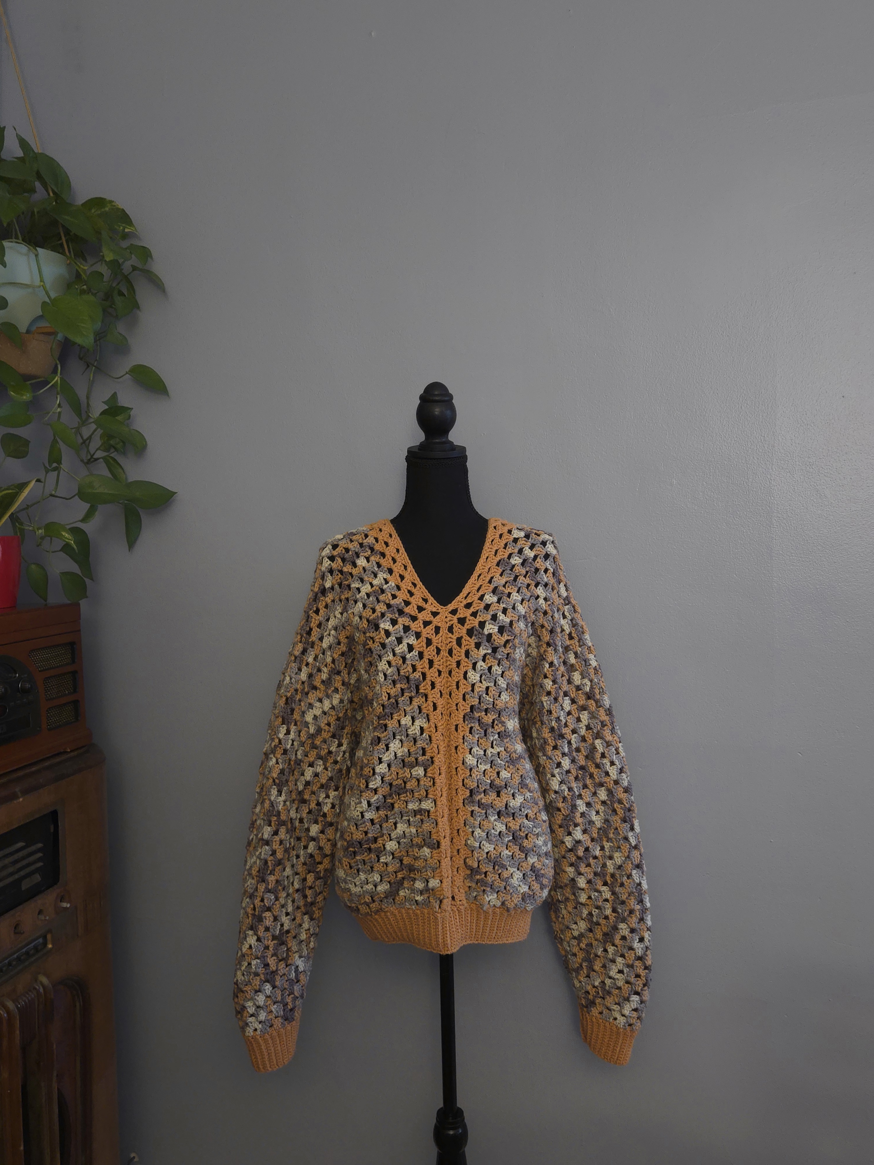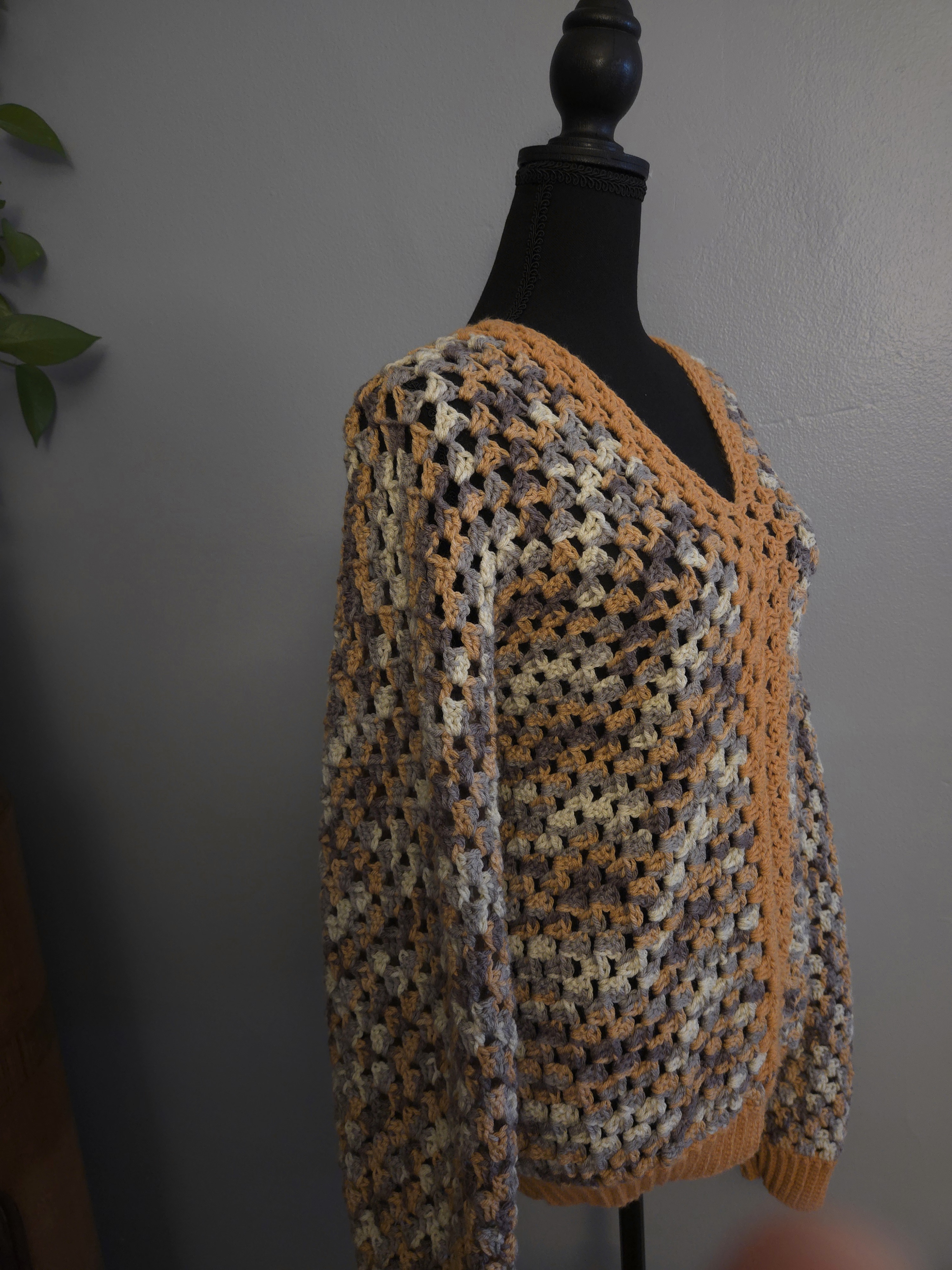 L/XL Granny Stitch Pullover Cardigan with Fall Colors, Mid Crop Style